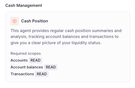 - Cash Position Agent: Our first specialized agent template allows you to automate cash reporting. You can provide Custom Instructions to tailor the tone, focus, and level of detail the agent uses when constructing its report.