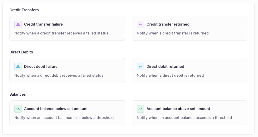 Stay on top of critical events with our new notification engine. You can now automate alerts for specific triggers such as payment approvals, low balances, or failed transactions, ensuring you never miss a beat.
