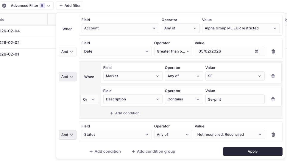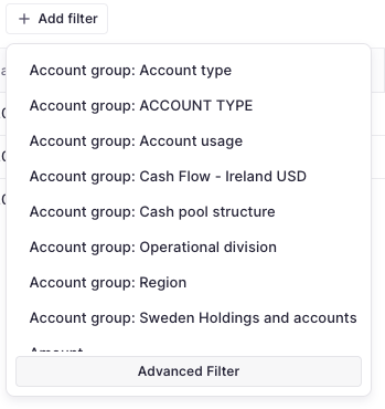 To open the Advanced Filter, click Add filter on any supported page and select Advanced Filter. A panel will appear where you can: