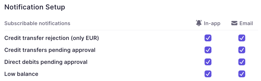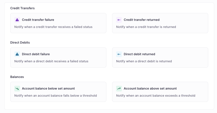 Stay on top of critical events. Notifications allow you to automate alerts for specific triggers such as payment approvals, low balances, or failed transactions.