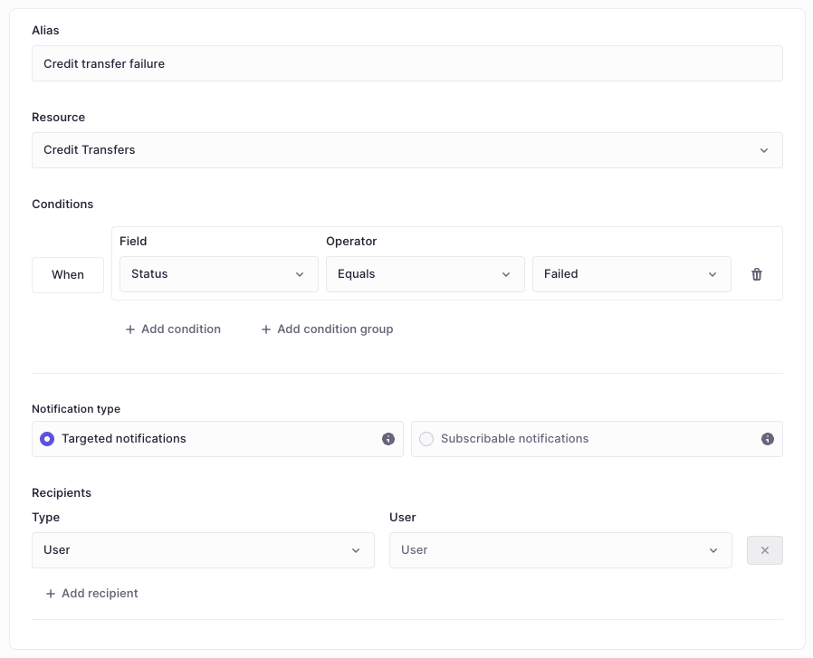 - Contextual alerts: If you set up a broad rule (e.g., "Notify on all Failed Payments"), users will only be notified about payments they actually have permission to view.