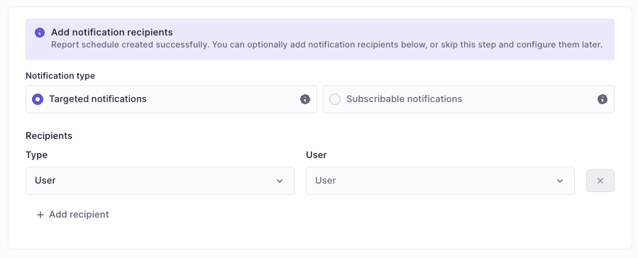 Once configured, the report will be generated automatically. You can optionally send it to a specific set of users or make it available for subscription on user profiles. If you don't want the report sent immediately, click Skip in the bottom left corner to save the schedule without sending.