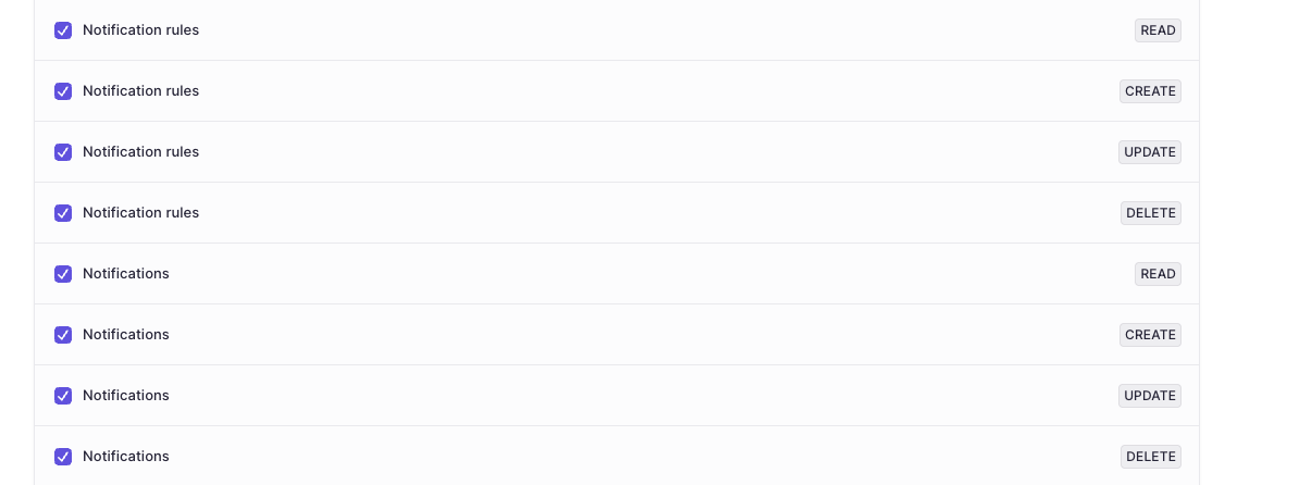 - manage notification rules, you need read, create, update, and delete permissions on Notification Rules