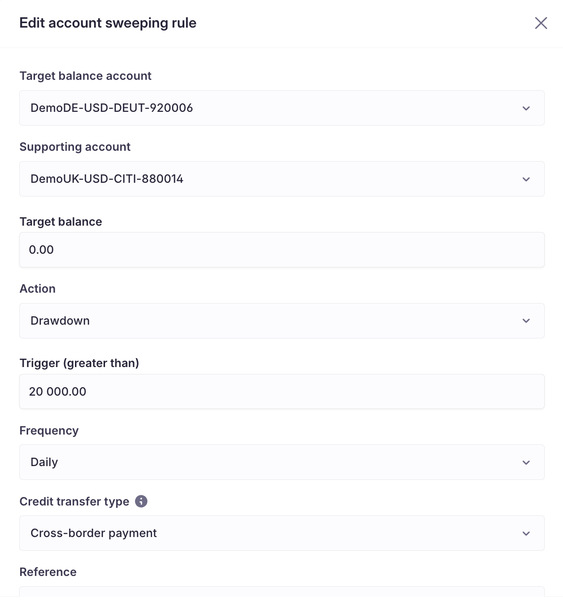 When the balance on the target account DemoDE-USD-DEUT-920006 exceeds the trigger balance of 20,000 USD, the surplus is transferred to the supporting account DemoUK-USD-CITI-880014 to reduce the target account down to a balance of 0 USD.