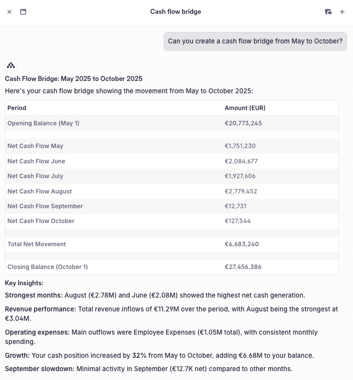 Ask the AI agent to analyze your balances and cash flows to surface trends, anomalies and patterns. It understands how your account balances and transactions connect, showing not just what changed but why.