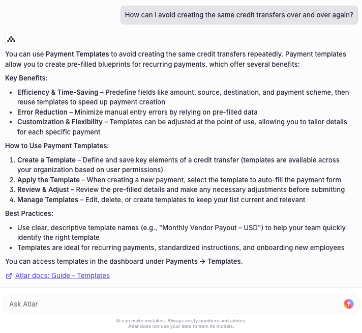 You can also ask questions about how Atlar works, where to find things, and best practices in treasury and setup. The agent draws from Atlar’s full knowledge base to give clear, actionable answers.